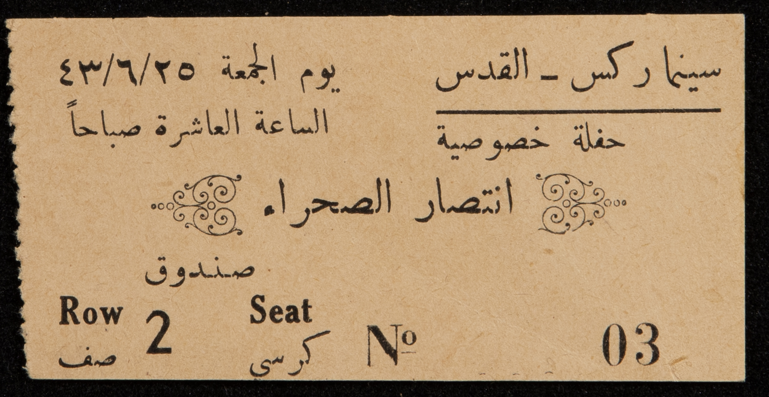 تذكرة دخول إلى حفلة خاصة بعنوان "انتصار الصحراء" صادرة عن "سينما ركس" في القدس