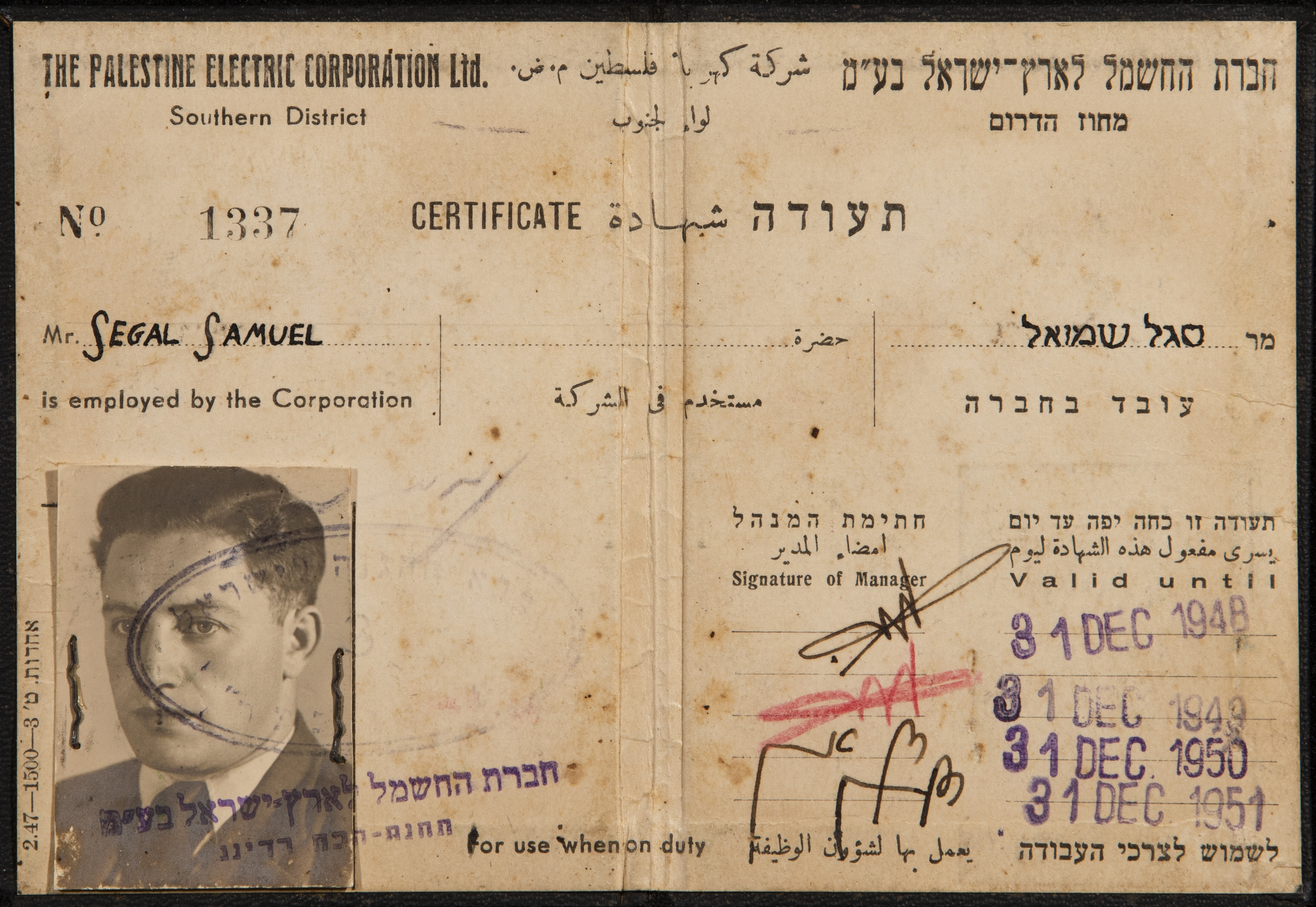 بطاقة موظف صادرة عن شركة "كهرباء فلسطين - لواء الجنوب"