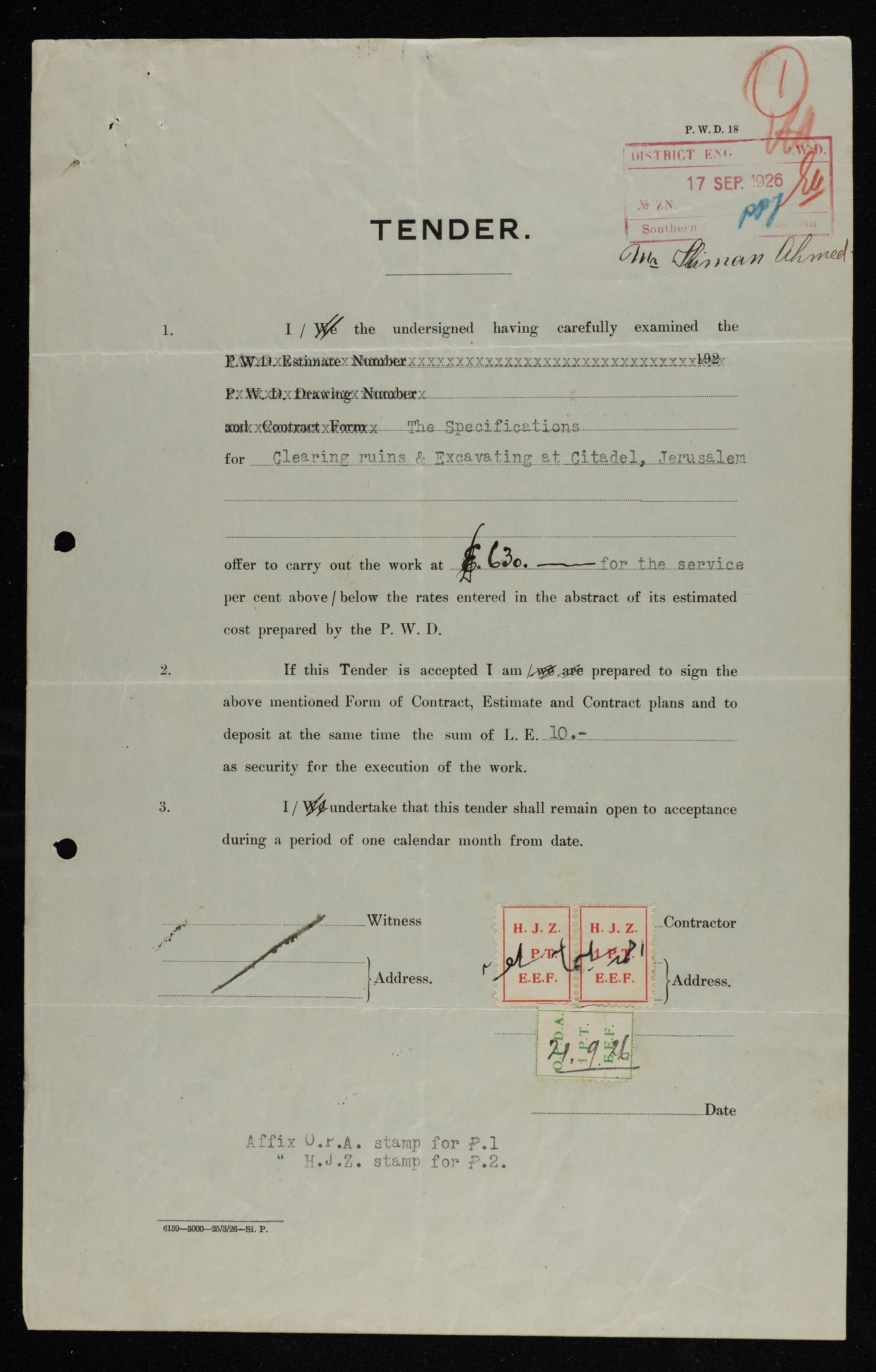 عطاء هندسي لأعمال حفريات وإزالة بقايا بناء في منطقة القلعة في مدينة القدس أصدرته سلطة الانتداب البريطاني على فلسطين