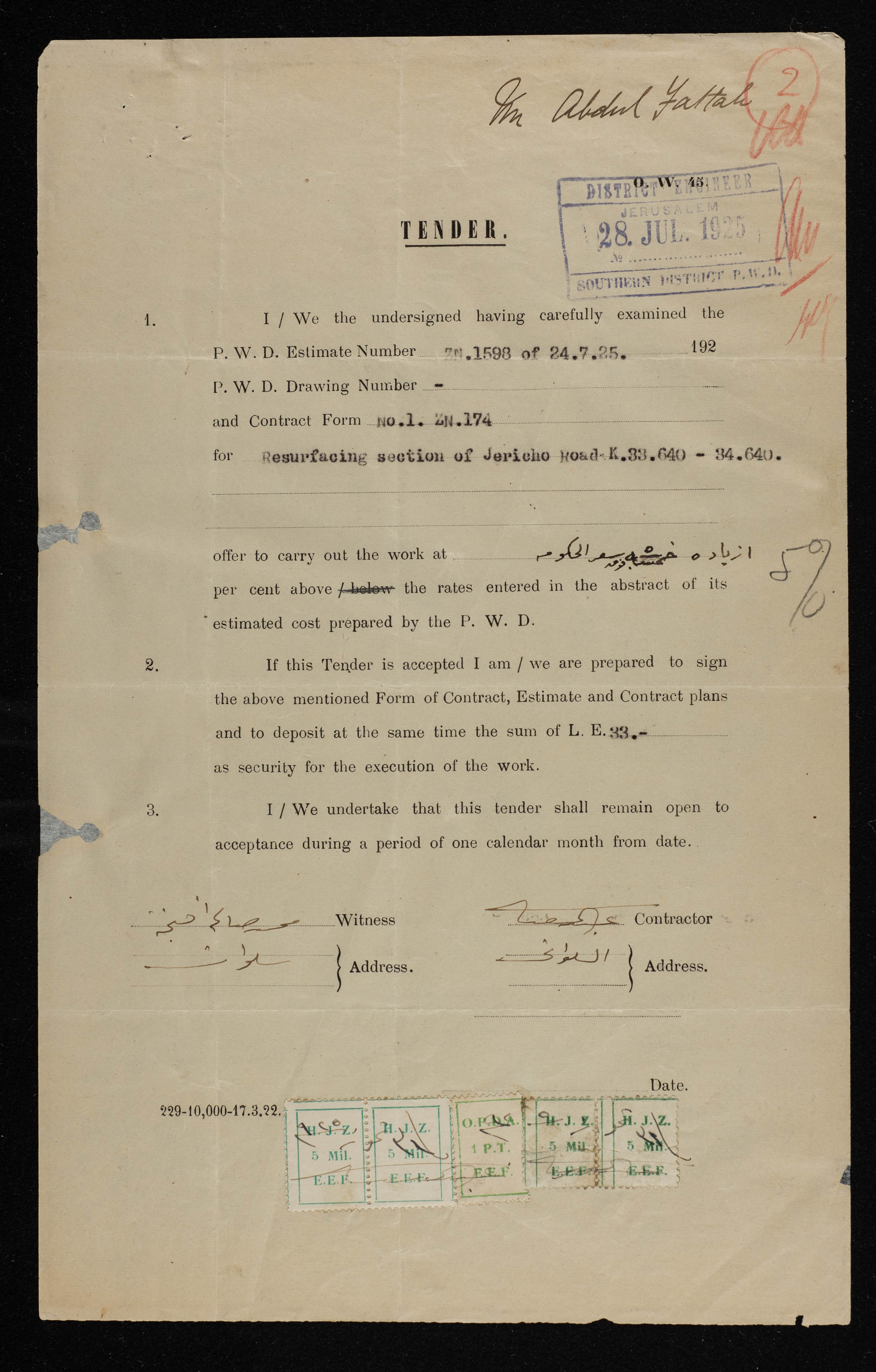 عطاء هندسي لتعبيد طريق أريحا أصدرته سلطة الانتداب البريطاني على فلسطين