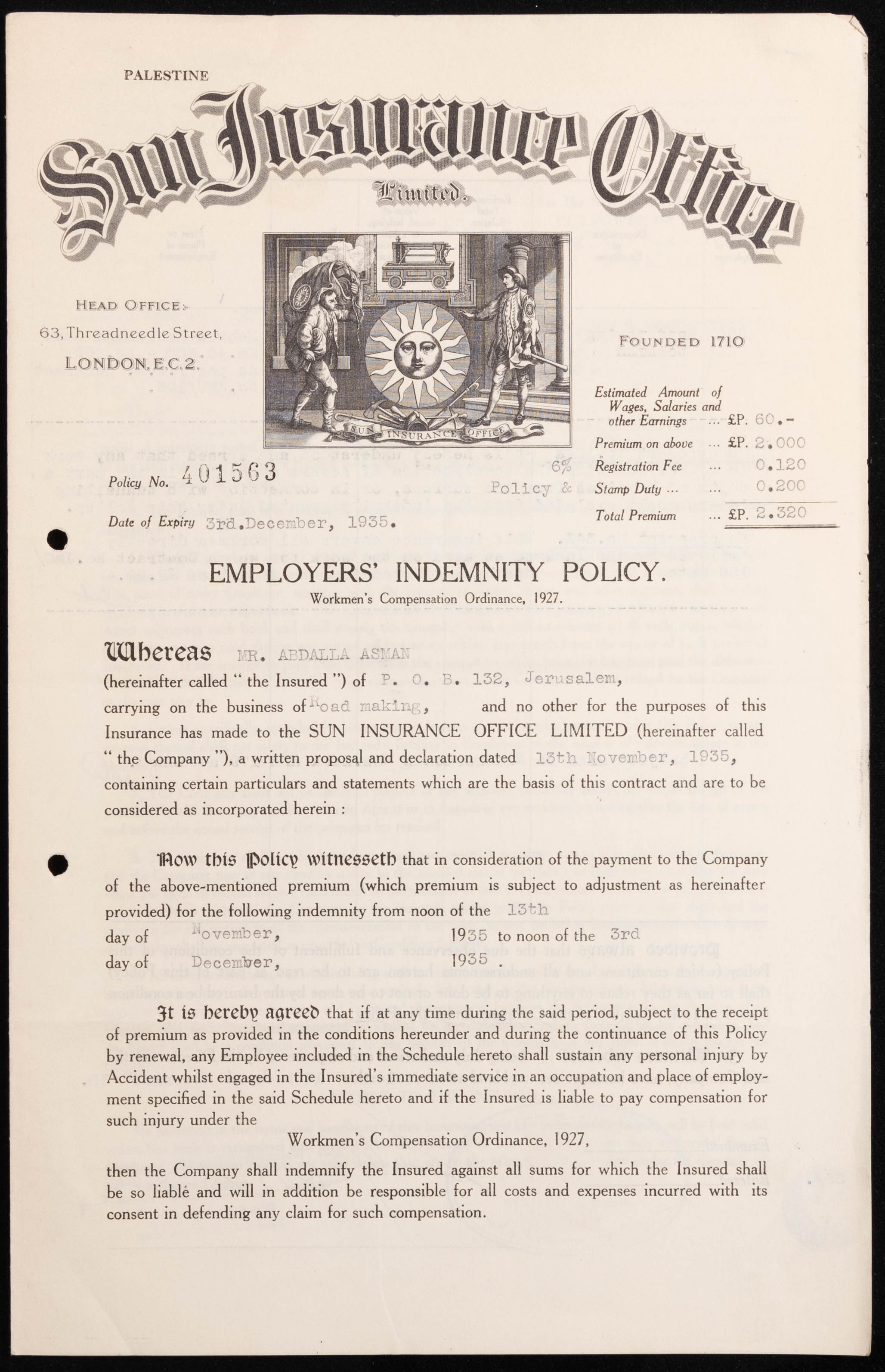 بوليصة تأمين صدرت عن مكتب صن للتأمين للمؤمن عبدالله عثمان