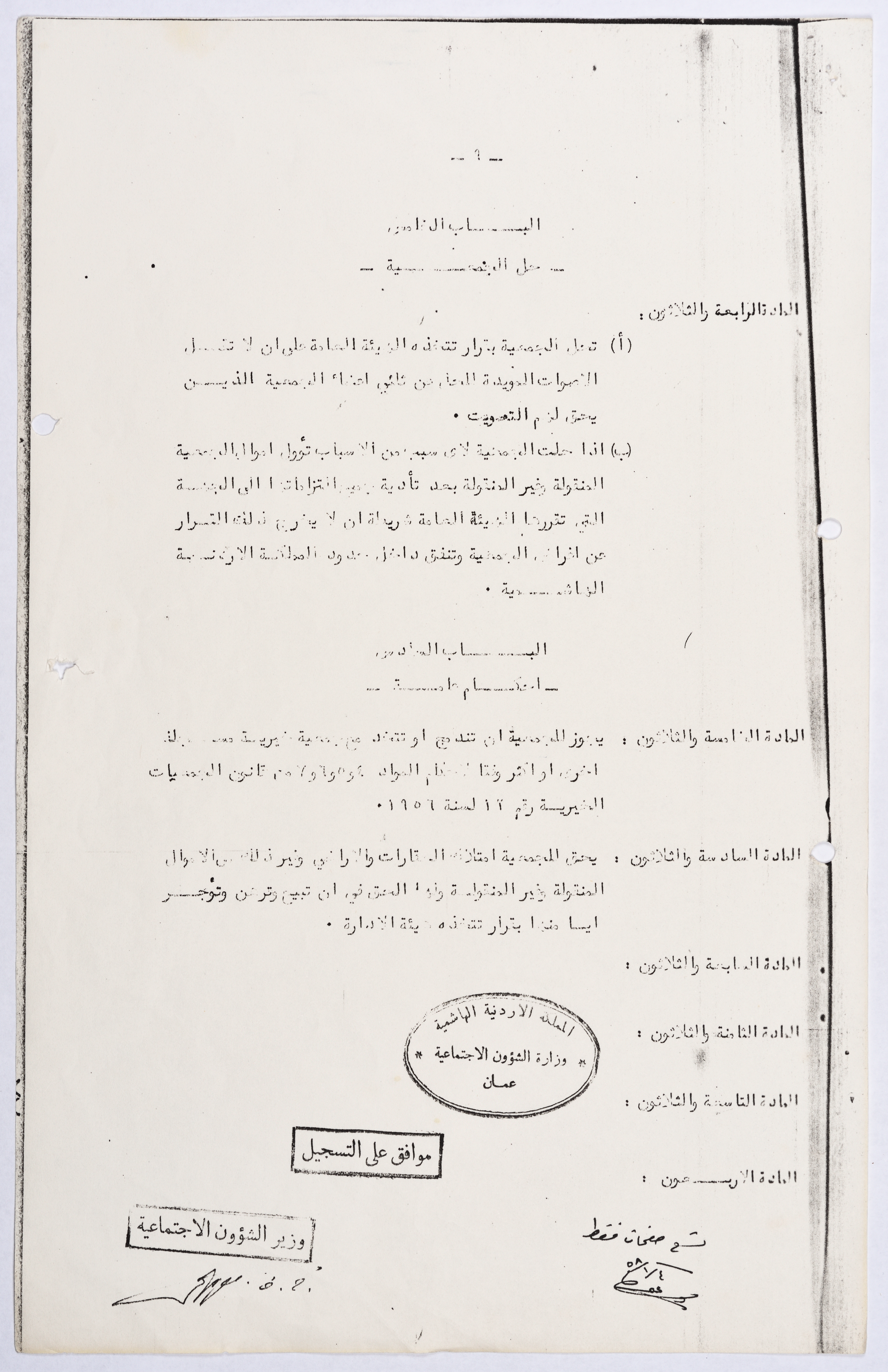 A paper document detailing the rules of procedure of the Arab Women's Union Society - Ramallah with the seal of the Jordanian Ministry of Social Affairs and Labour stamped on it. The rules are divided into 6 main sections.